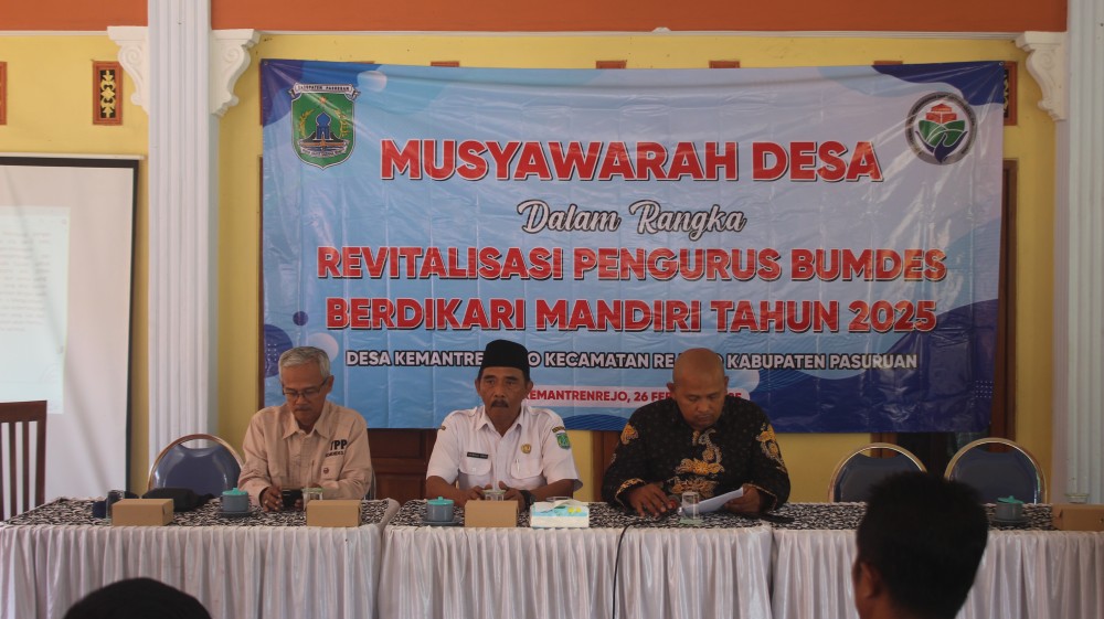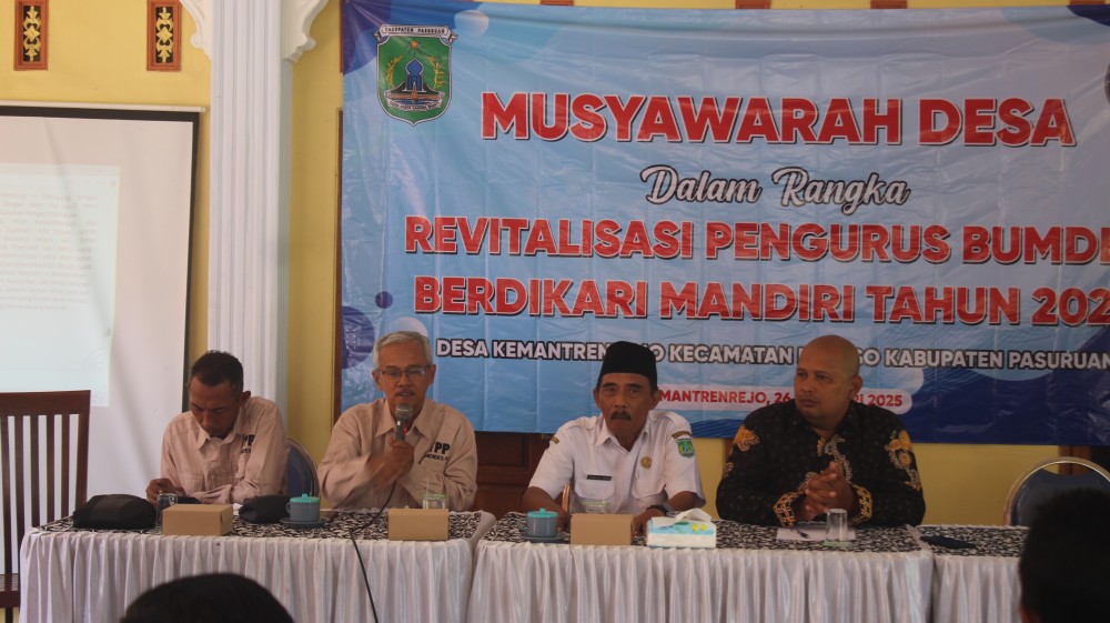 Pemerintah Desa Kemantrenrejo Kecamatan Rejoso Pasuruan menggelar Musyawarah Desa (Musdes) merevitalisasi kepengurusan Badan Usaha Milik Desa (BUMDes) , Selasa (30/4/2025) di pendopo desa.